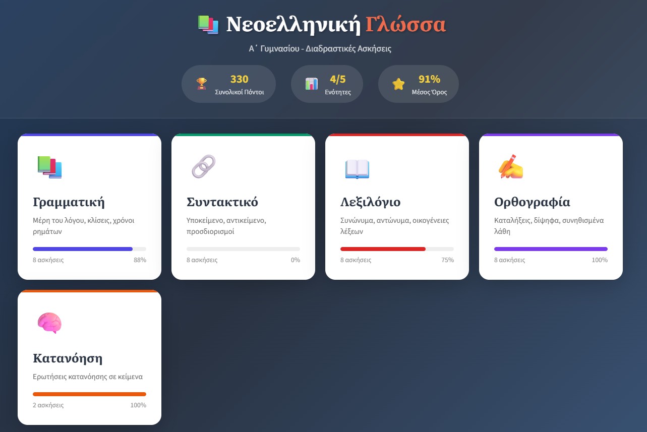 Η εφαρμογή μας για τη Νεοελληνική Γλώσσα Α΄ Γυμνασίου περιλαμβάνει 5 θεματικές ενότητες με πάνω από 40 διαδραστικές ασκήσεις: